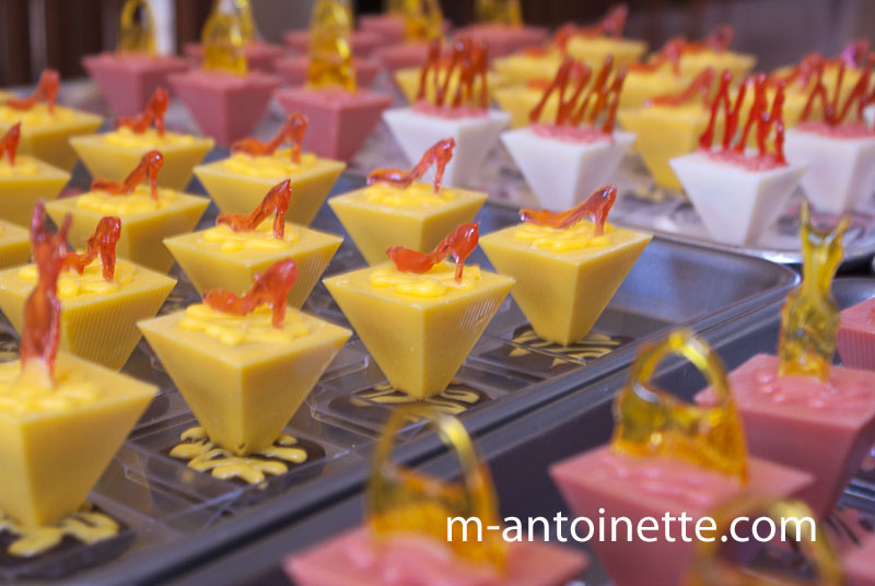 Petit fours topped with sugar glass shoes, dresses, purses and the Neiman Marcus logo.